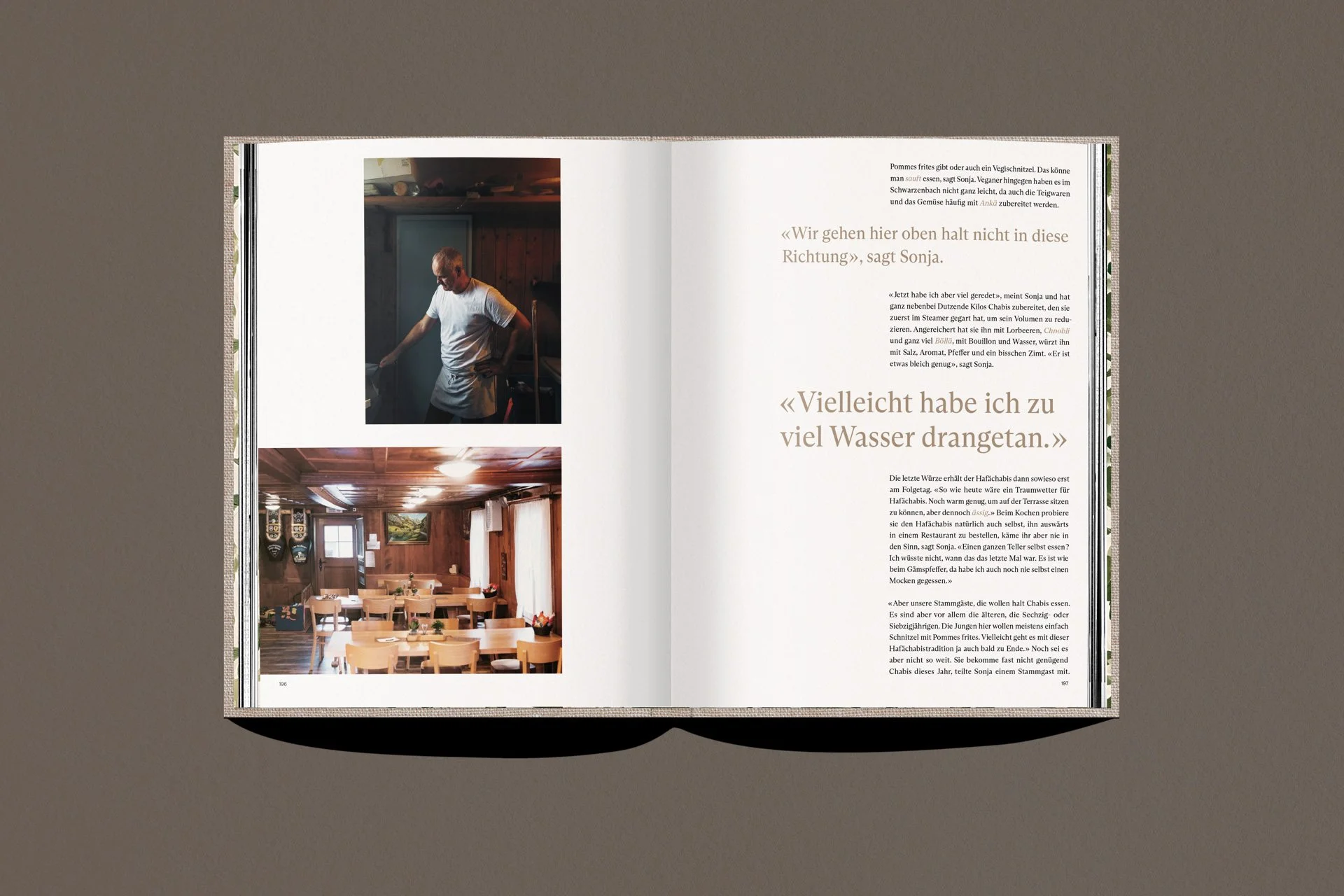 Das Buch setzt auf ein harmonisches Layout, bei dem die Bilder links und der Text rechts angeordnet sind, wodurch ein fliessender Erzählstrom entsteht, der die Leser*innen ohne Unterbrechung mitnimmt und eintauchen lässt. Die grossformatigen, ungestellten Fotografien schaffen eine unmittelbare Nähe zu den Köchinnen und Köchen und lassen ihre Persönlichkeit und die Atmosphäre ihrer Küchen authentisch lebendig werden.
